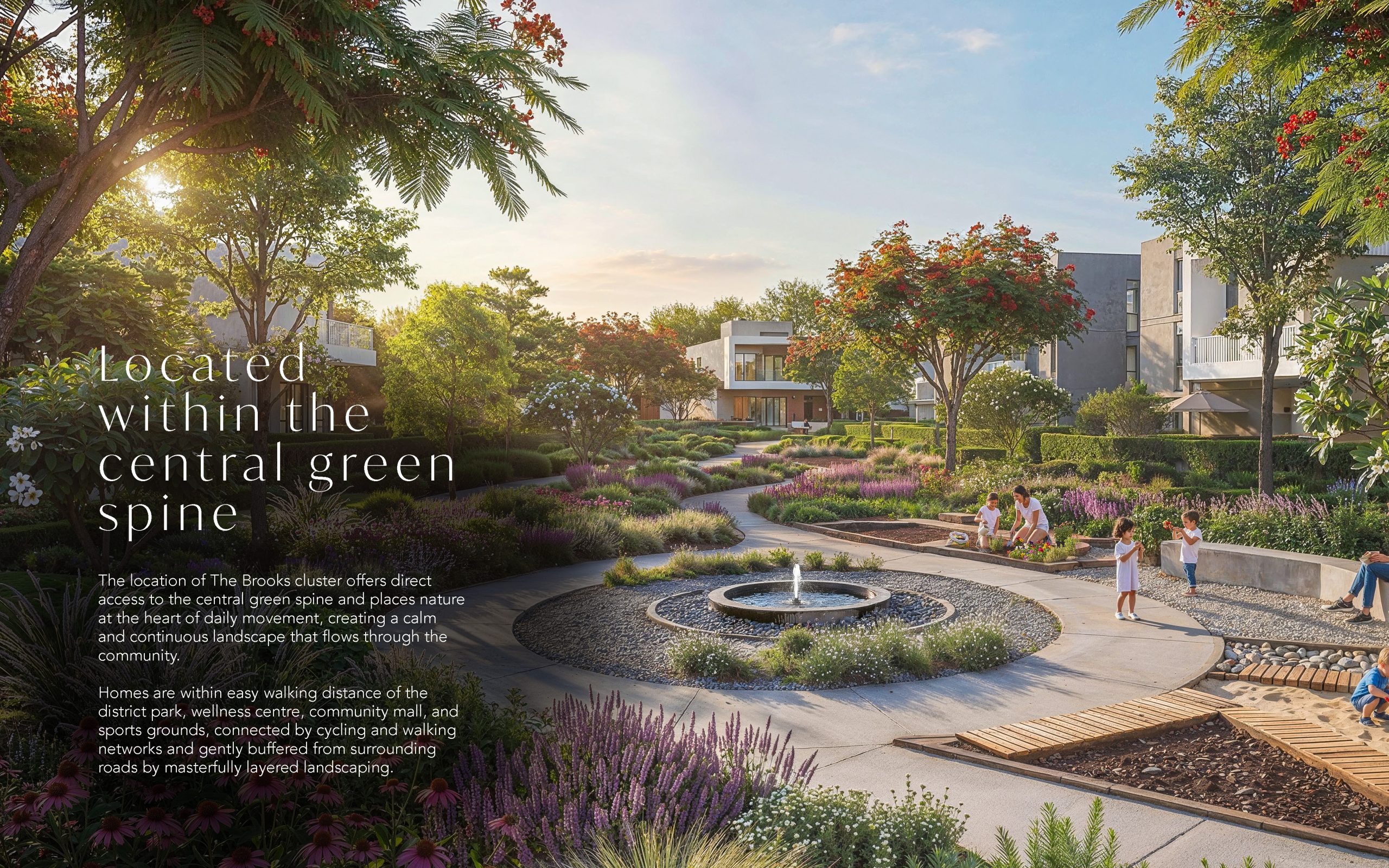 The location of The Brooks cluster offers direct access to the central green spine and places nature at the heart of daily movement, creating a calm and continuous landscape that flows through the community.